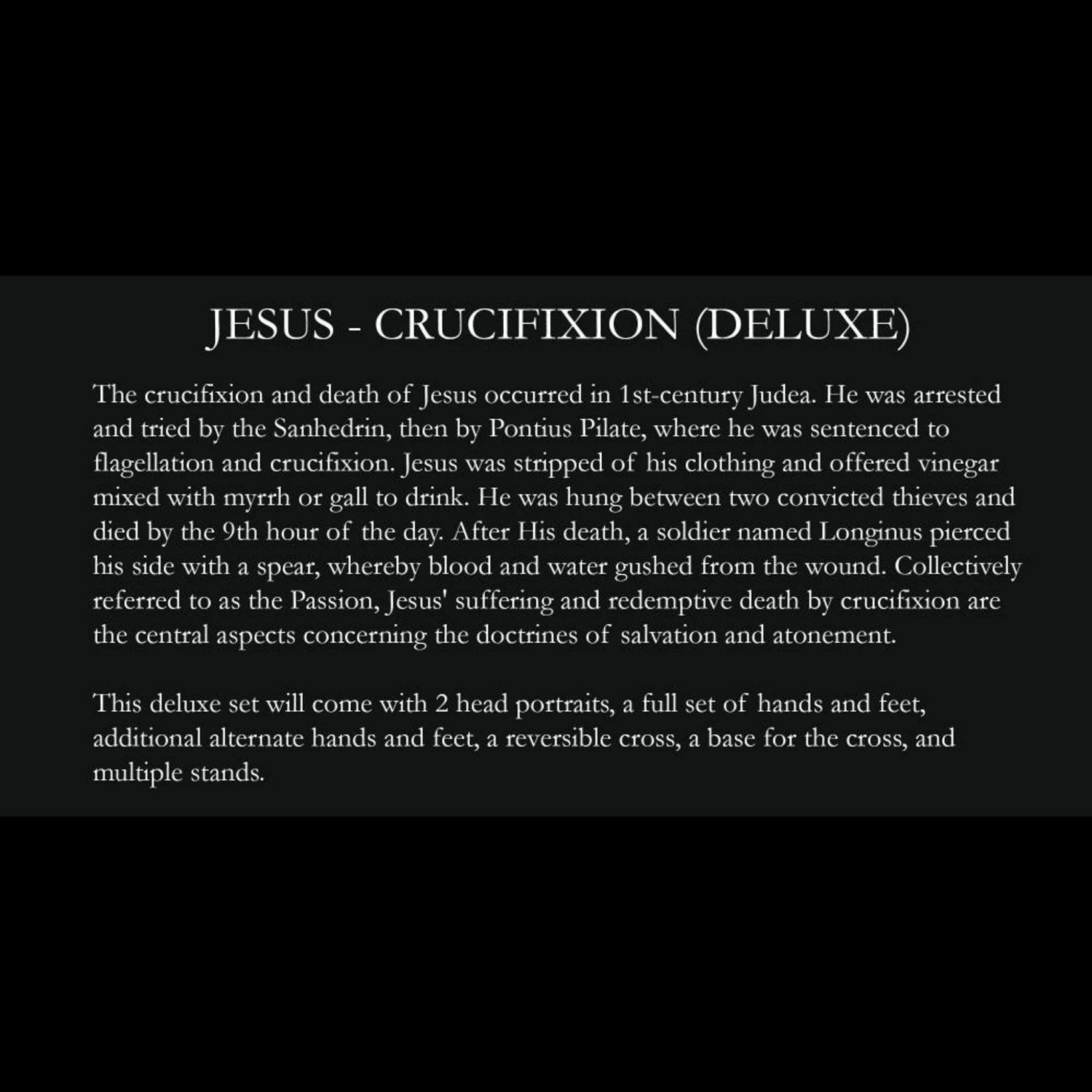 - Includes: Jesus Christ figure, Alternate head, 7 Alternate standard hands, Alternate pair of stand feet, 3 Alternate pairs of crucifixion hands, 3 Alternate pairs of crucifixion feet, Cross with base, and Stand