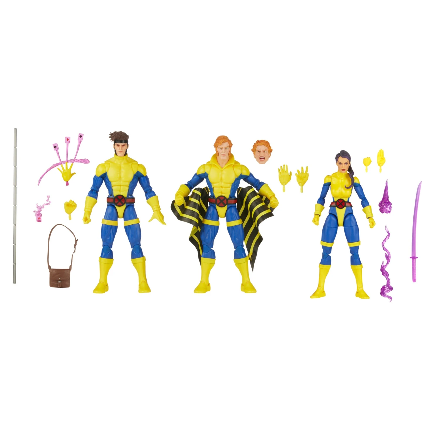 - EVEN MORE ACCESSORIES: Gambit figure includes bo staff, satchel, & alternate hands with kinetically-charged playing cards accessories; Psylocke figure includes alternate hands, psi effects & psionic sword accessories