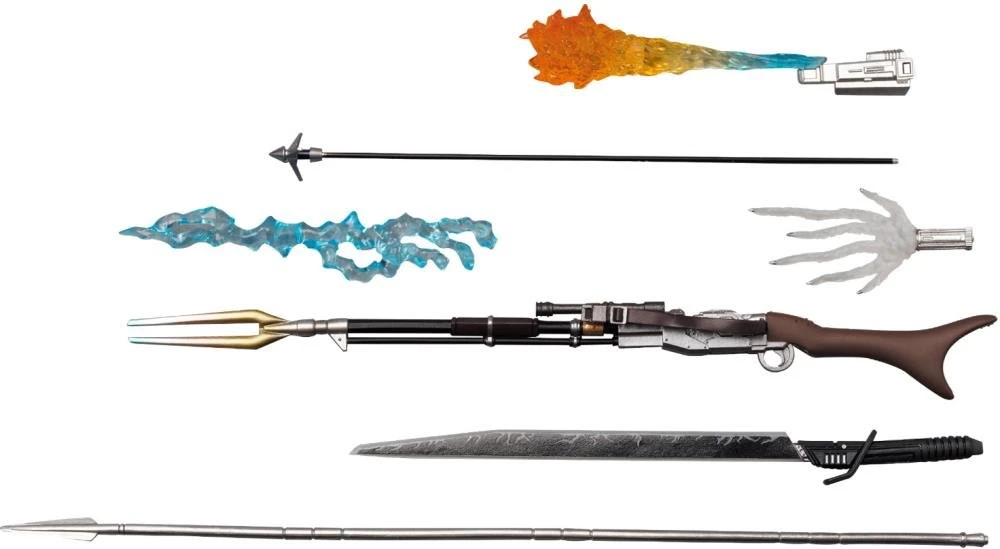 - Box Contains The Mandalorian figure, 3 Head sculpts, Interchangeable hands, Amban rifle, Blaster pistol, Beskar spear, Dark saber, Ripcord line, Taser effect, Flame thrower effect, Whistling bird effect, Jetpack and 2 blast effects, Grogu figure, Grogu satchel, & Stand