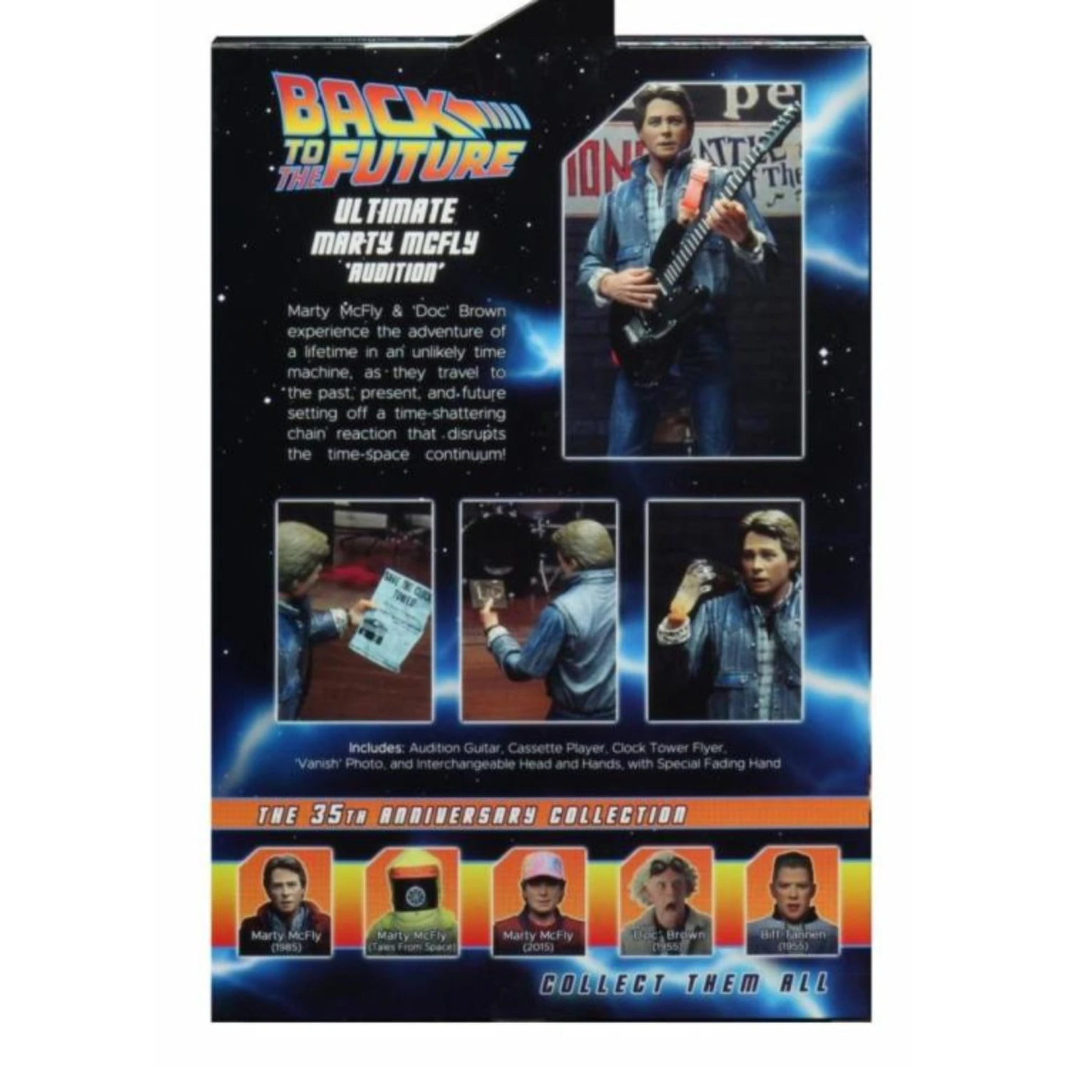 Audition Marty comes with an all-new jacket sculpt without the vest. He is also equipped with brand new accessories, including an audition guitar, a fading hand, a cassette player, and a McFly family photo.