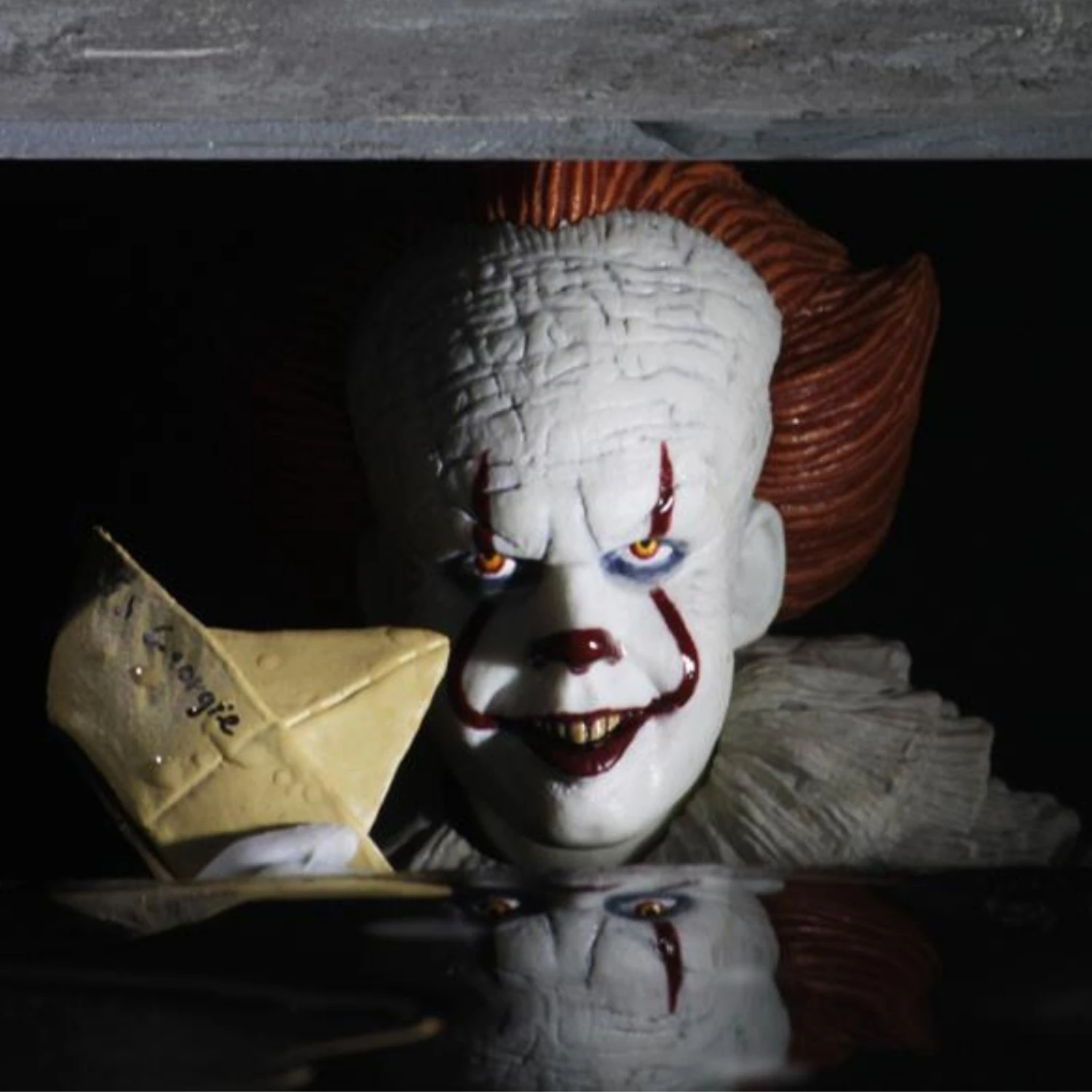 Based on Bill Skarsgård’s portrayal of the nightmare-inducing clown, this 7” scale figure has been painstakingly detailed to be as accurate to Pennywise’s ornate costume as possible. To recreate the most terrifying scenes from the movie, the fully articulated figure features three interchangeable heads, interchangeable hands, red balloon and paper boat. Comes in collector-friendly deluxe window box packaging with opening flap.