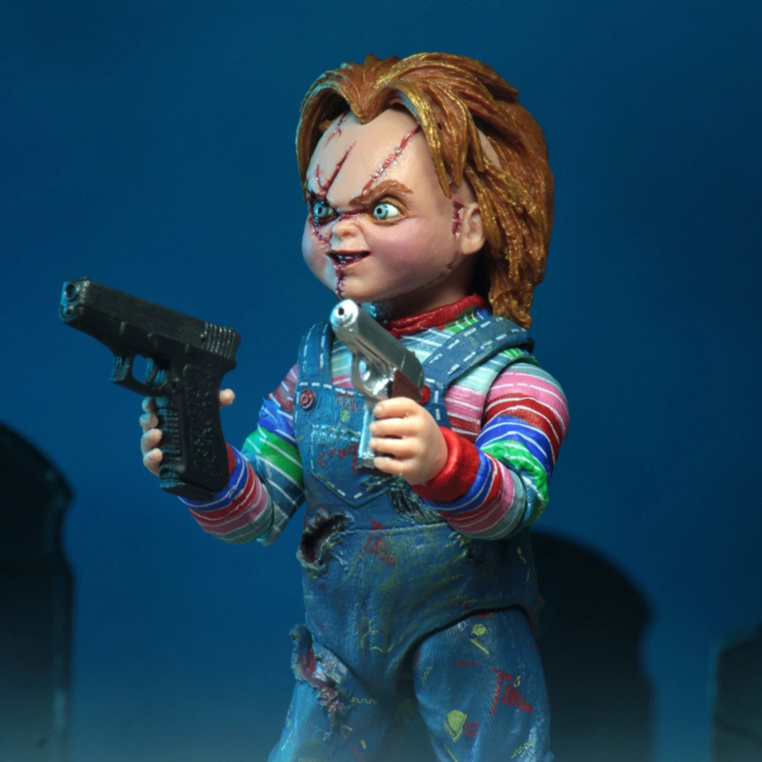 This Ultimate action figure 2-pack includes Chucky and Tiffany, who features a fabric skirt and an extra set of removable arms so she can wear her iconic leather jacket. The set also includes tons of accessories to recreate the movie’s best scenes: 6 interchangeable heads, 2 shovels, 2 pistols, 2 knives, bottle, baster, necklace and more! The figures stand 4″ tall and have over 20 points of articulation.