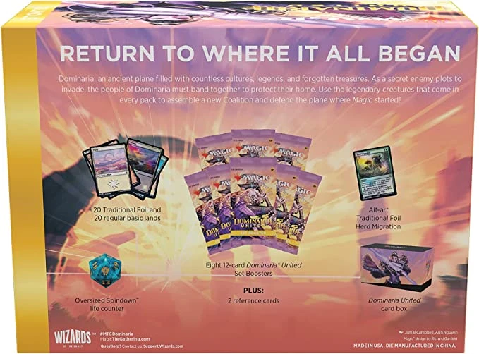 The Dominaria United Bundle contains 8 Dominaria United Set Boosters—the best boosters to open just for fun—plus exclusive accessories, with 40 basic lands (20 traditional foils and 20 nonfoils), 1 Traditional Foil promo card with Bundle-exclusive alternate art, 1 oversized Spindown life counter, 1 card storage box, and 2 reference cards.